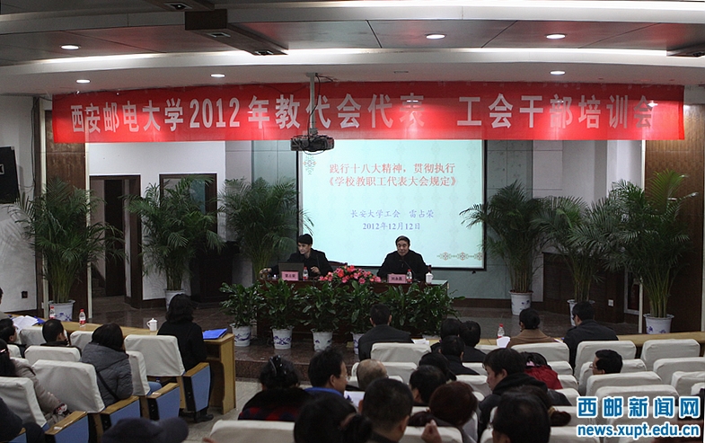 12月12日下午,校工会在长安校区行政楼报告厅举办2012年教代会代表、工会干部培训会,陕西省教育工会工运理论研究会副秘书长雷占荣受邀作题为《践行十八大精神,贯彻执行〈学校教职工代表大会规定〉》的报告。党委副书记、工会主席刘永昌主持培训会,教代会全体代表,校工会和各分工会全体干部,教代会各委员会成员、女工委、青工委成员参加培训会。