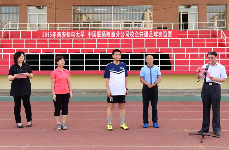7月15日下午17时,西安邮电大学、中国联通陕西分公司校企共建足球友谊赛在西安邮电大学长安校区东足球场举行。中国联通陕西分公司副总经理李武、直属工会主席陈发斌,西安邮电大学党委副书记、工会主席刘永昌以及双方全体职工足球队员参加比赛开幕式。校工会常务副主席左建莉主持开幕式。
