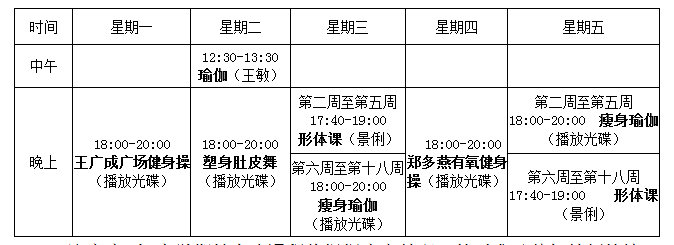 4.注意事项:本学期健身班课程将根据广大教职工的需求及聘任教师的情况随时进行调整,请关注微信群消息,随时了解健身班的课程安排!